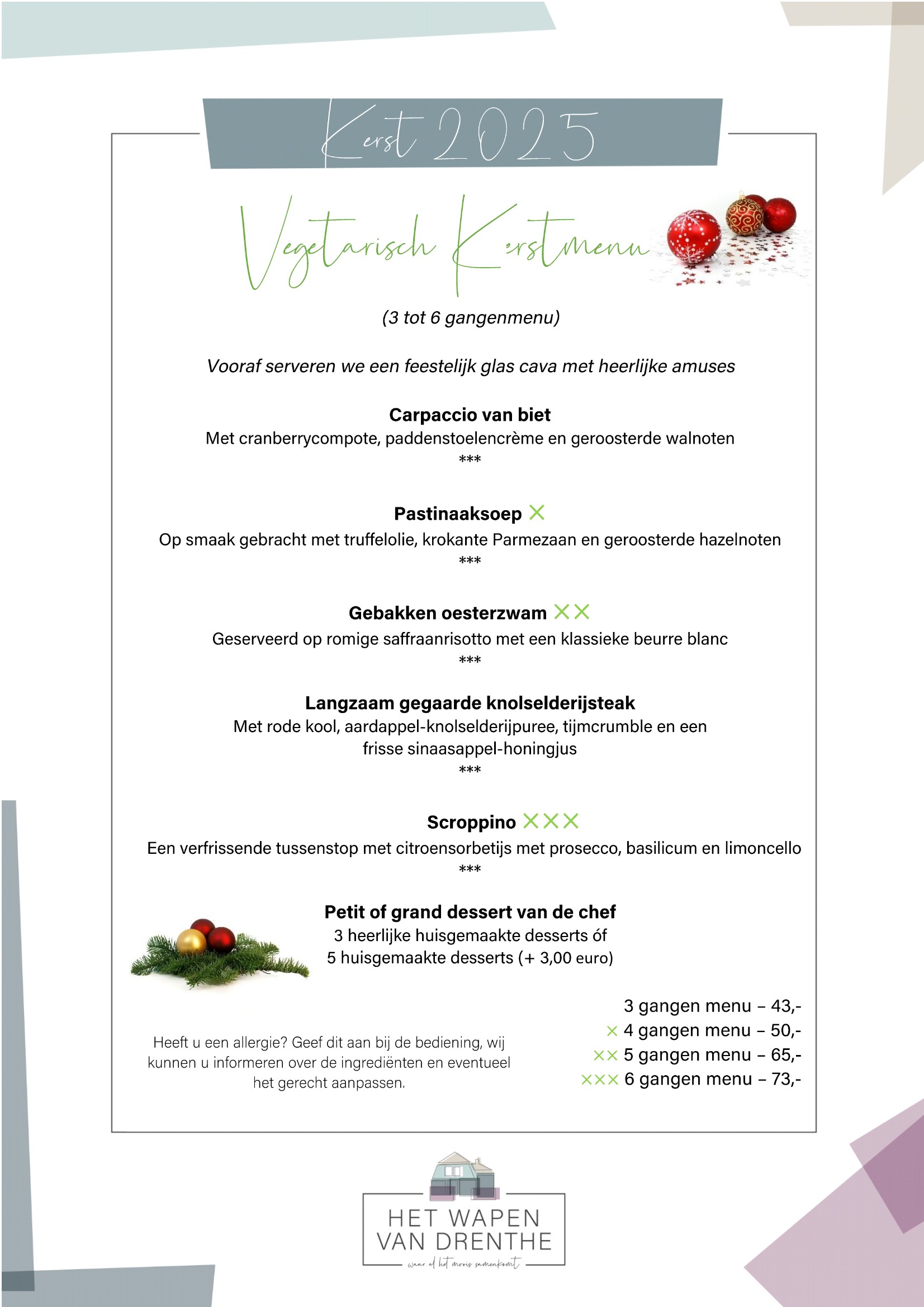 Speciaal voor de kerstdagen heeft ons keukenteam een heerlijk menu samengesteld. U kunt kiezen uit 3 tot 6 gangen. Vooraf krijgt u van ons 2 heerlijke amuses met een feestelijk glas (alcoholvrije) cava. Bij het hoofdgerecht heeft u een smakelijke keuze (wildzwijn of ossenhaas)*. Laat u ons alstublieft van tevoren weten wat uw voorkeur is? Zo kunnen wij zorgvuldig inkopen en zorgen voor een feestelijk en vers kerstdiner. Voor de kleine genieters (tot 12 jaar) hebben wij een speciaal 3-gangen kindermenu!